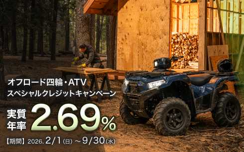 対象期間中、カワサキ正規取扱店(オフロード四輪取扱店/ATV取扱店)でカワサキのオフロード四輪車・ATV(全モデル・全年式対象)の新車をご購入の際に、実質年率2.69%のスペシャルクレジットをご利用いただけます。