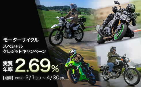 全国のカワサキ正規取扱店でカワサキモーターサイクル新車の購入時にご利用いただける、2.69%スペシャルクレジットキャンペーンをご用意いたしました。